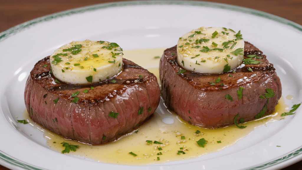 Tender filet mignon seared to perfection, topped with a flavorful garlic herb compound butter, creating a classic steakhouse experience at home.