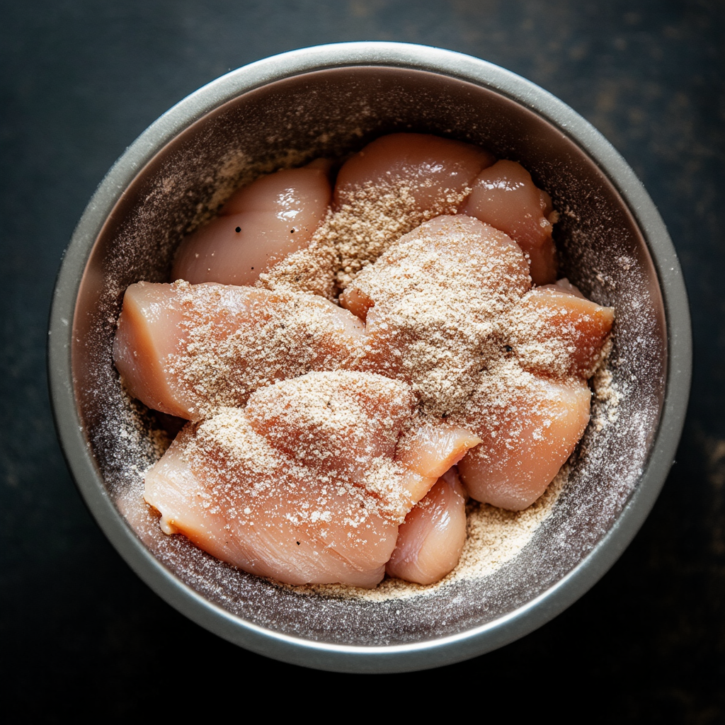 In a separate bowl, combine flour, powdered sugar, salt, pepper, and paprika. Dredge marinated chicken in the flour mixture, ensuring it's evenly coated.Coating the chicken creates a crispy, flavorful crust when fried.